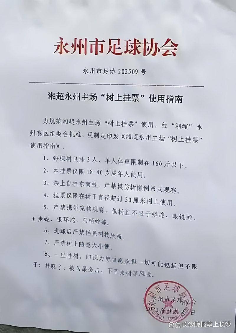 9月21日晚,2025“湘超”联赛第二轮,永州市足协向球迷推出了“树上挂票”,并发布《湘超永州主场“树上挂票”使用指南》:“每棵树限挂3人,单人体重限制在160斤以下。”“禁止自挂东南枝,严禁模仿树懒倒吊式观赛。”“严禁携带宠物观赛,包括且不限于蟒蛇、眼镜蛇、五步蛇等。”……